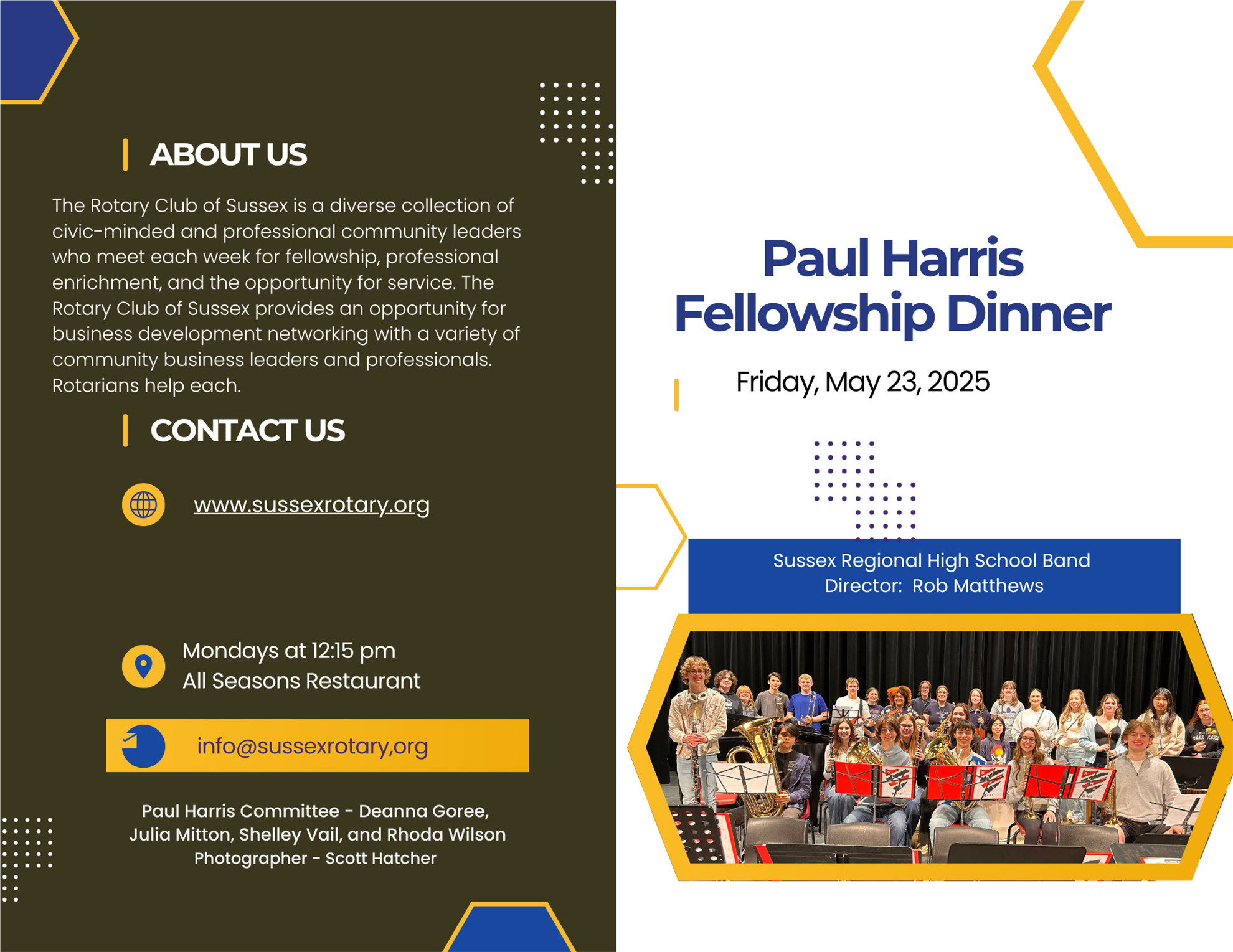The event was energized by a group of talented students from Sussex Regional High School who entertained at the event. We want to thank Rob Matthews, Director, for bringing the band and performing. This past year The Rotary Club of Sussex partnered with the high school by getting a Rotary District Grant to repair band instruments for the band. The band has competed in several competitions this past year gaining several awards. A collection was taken for the band during the evening and $400 was raised for ongoing support.