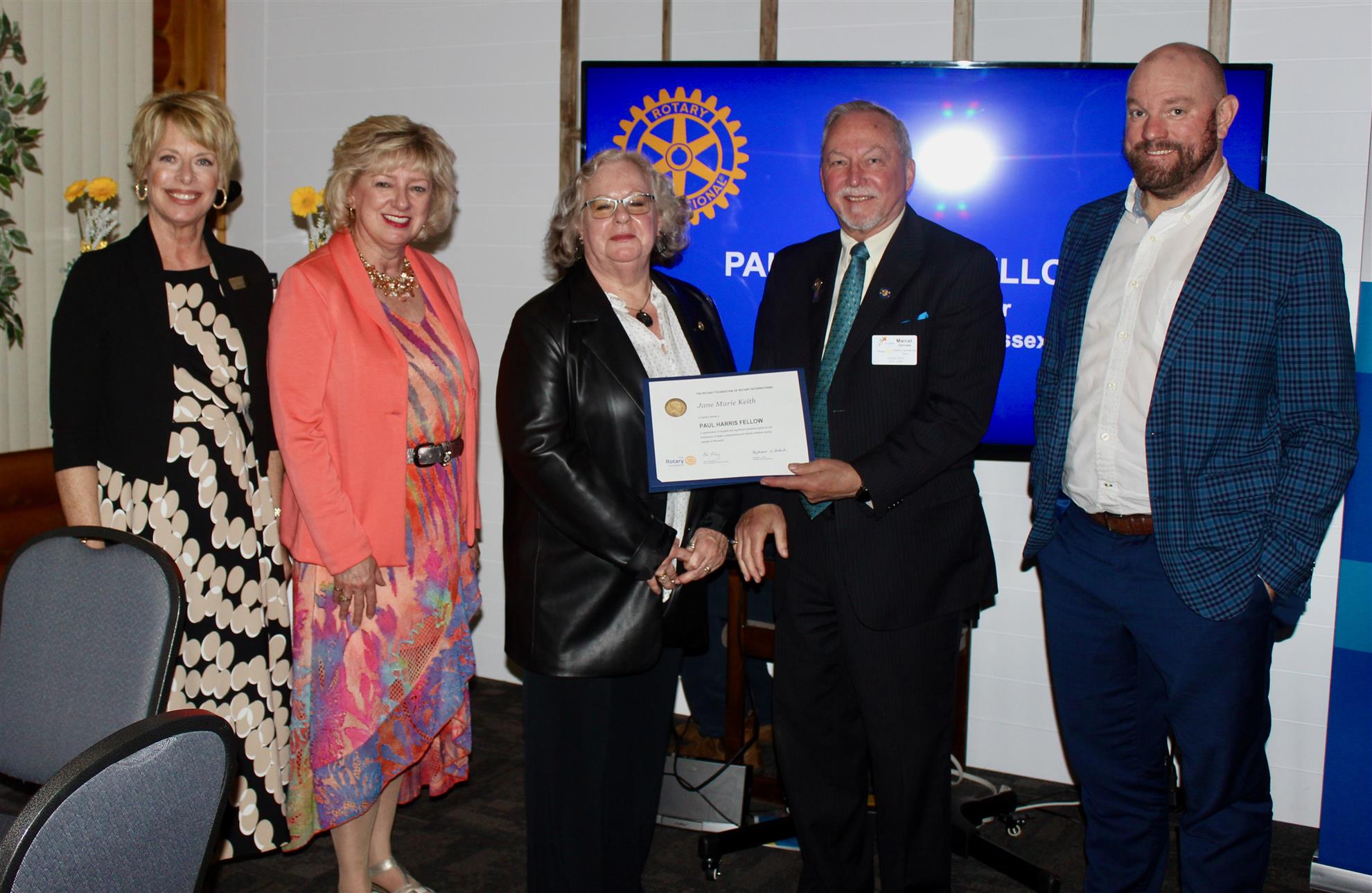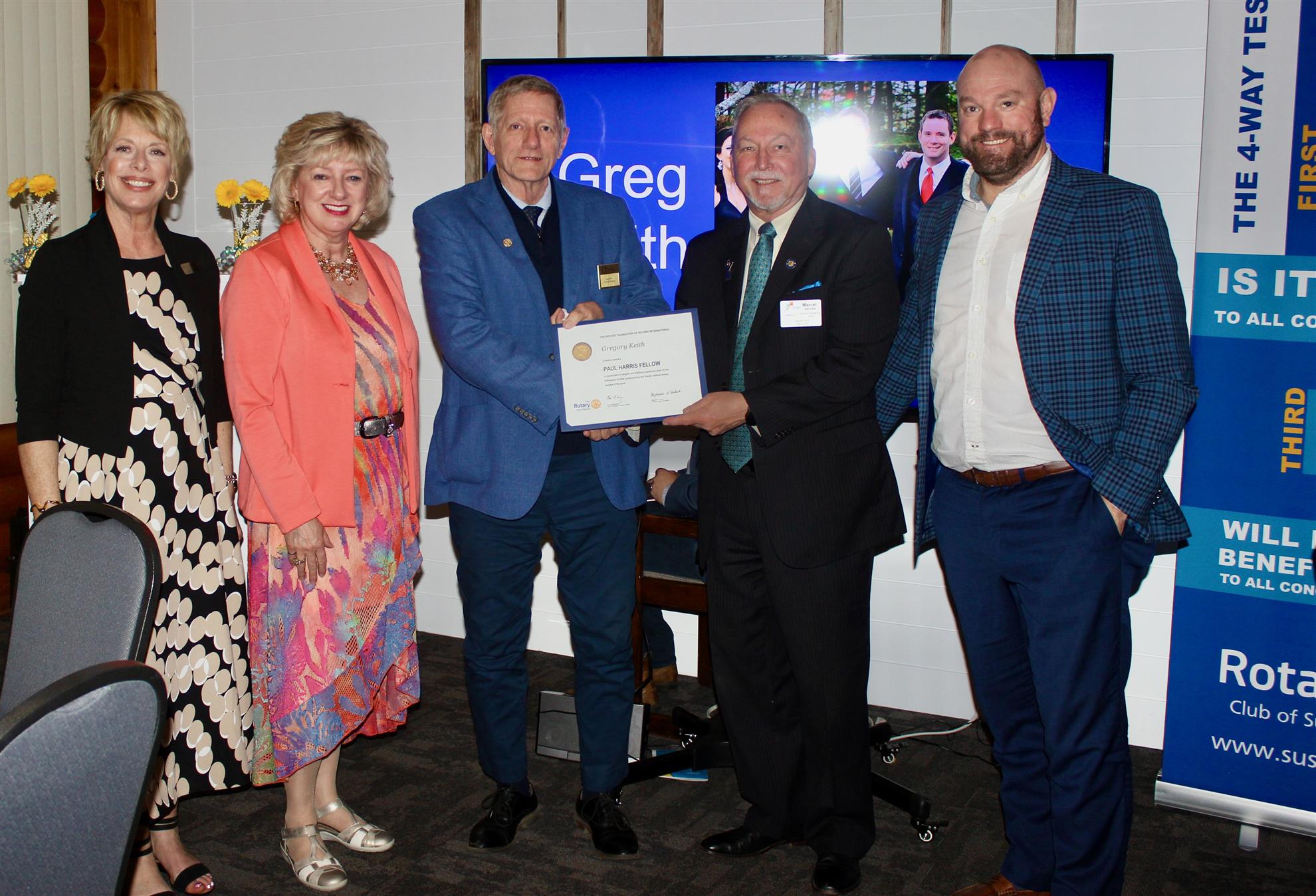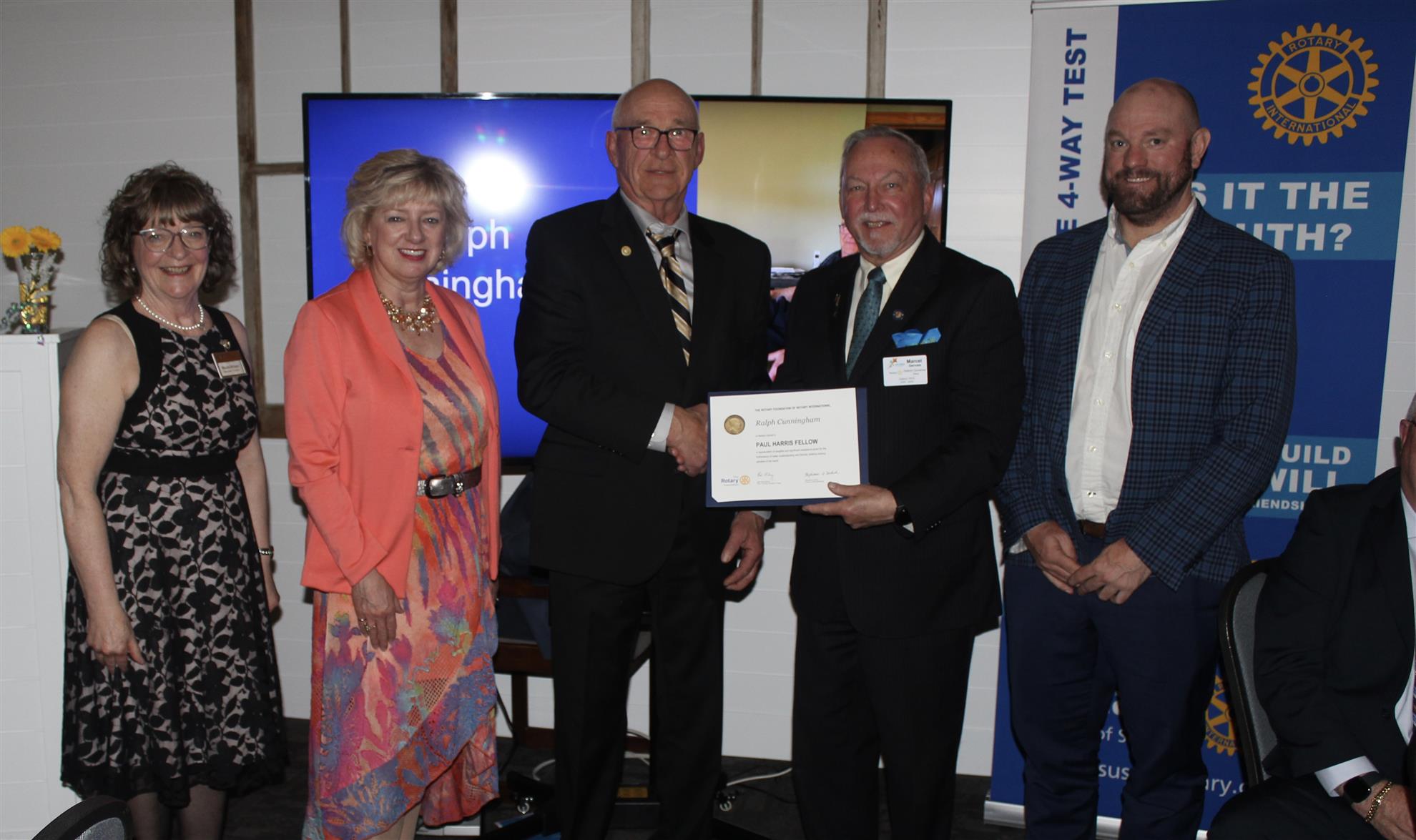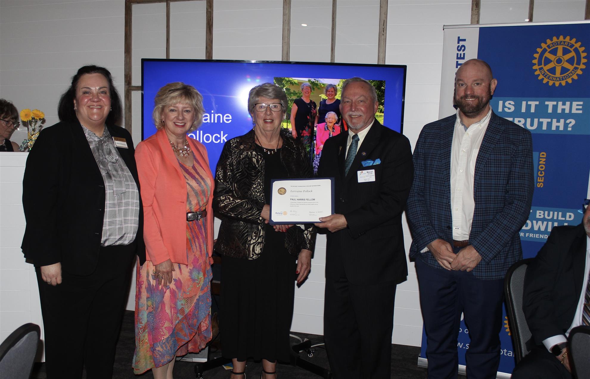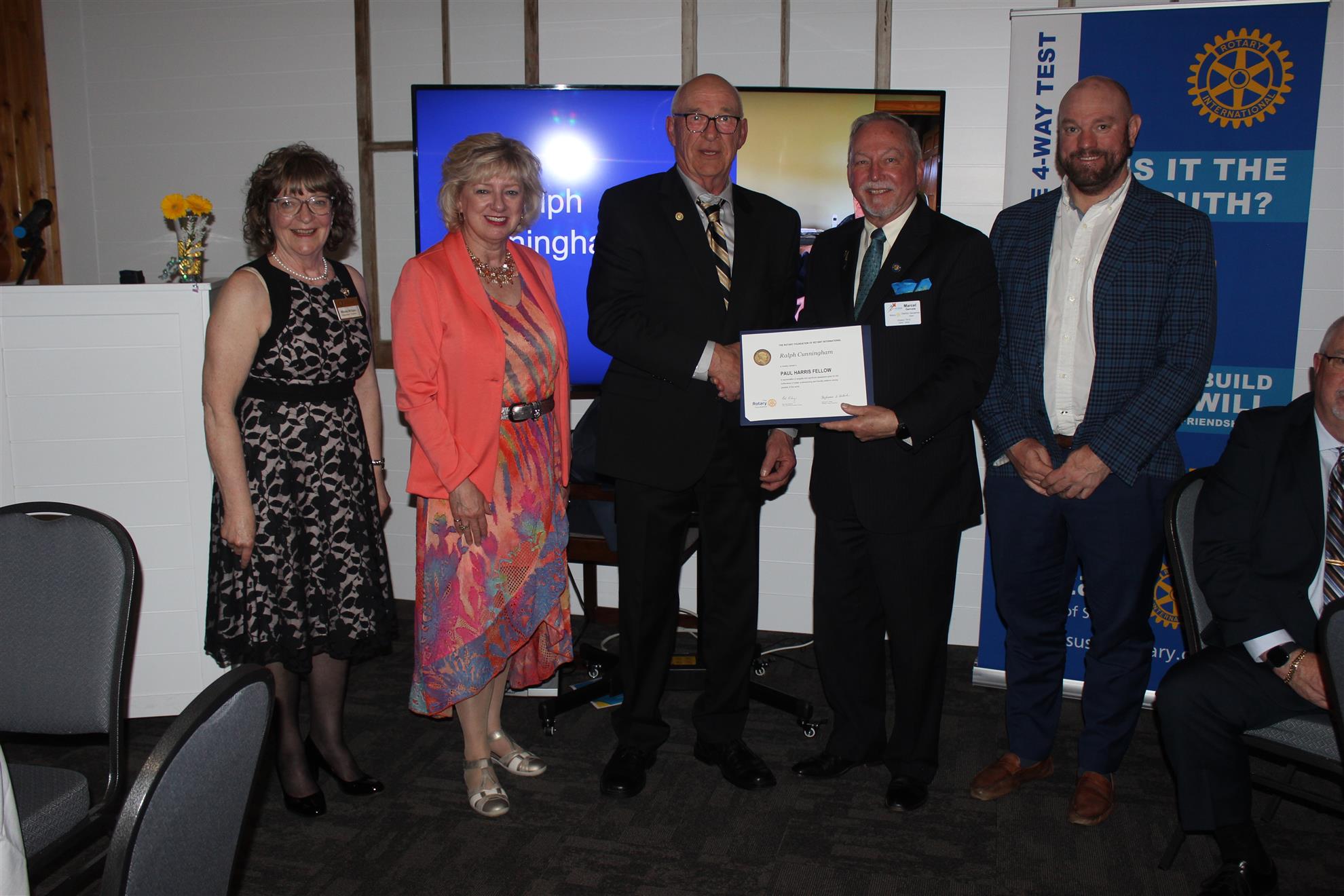 Introducing our new Rotary Paul Harris Fellows - Lou McNamara, Lorraine Pollock, Jim Andrew, Greg Keith, Jane Keith, and Ralph Cunningham. The celebration event took place at All Seasons Restaurant on Friday, May 22, 2025. The evening was filled with food, presentations, laughs, and entertainment.